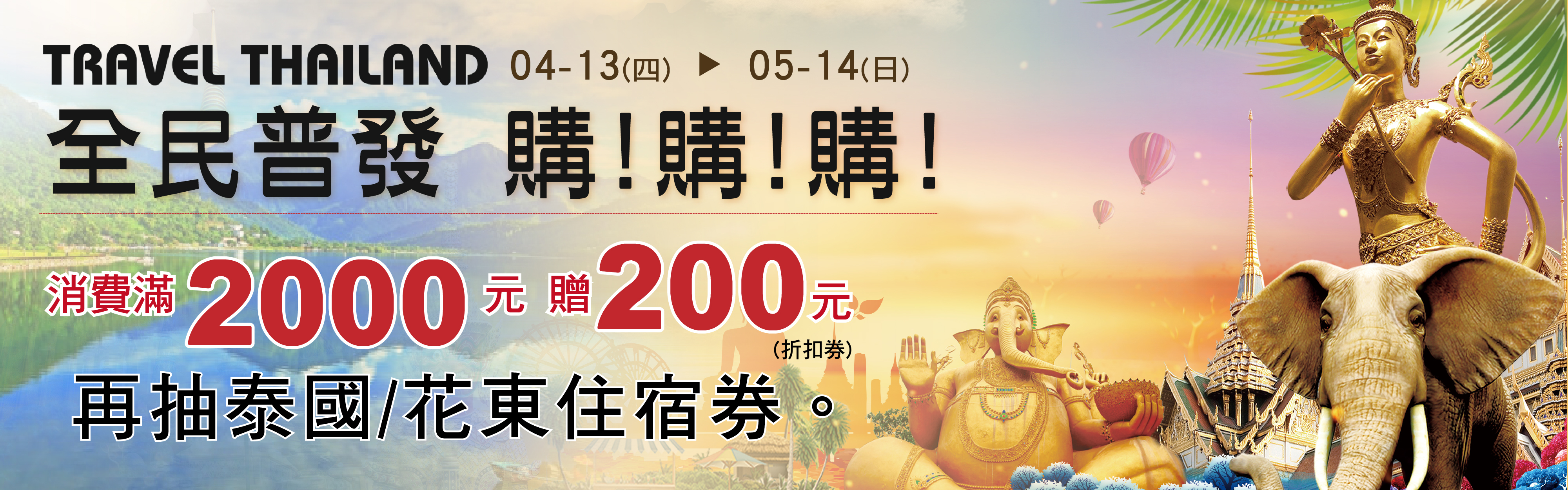 4/13 - 5/14 單筆訂單滿$2000即贈200折扣券!再抽泰國住宿券/花東住宿券!