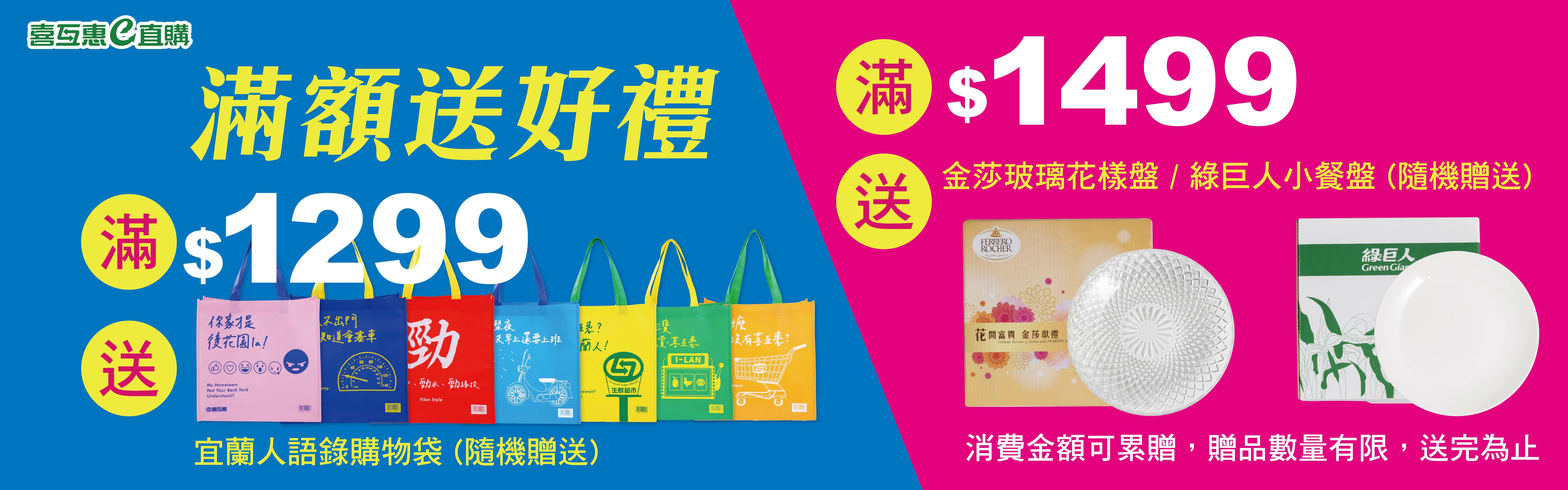 1、滿額送好禮,滿$1299(優惠折扣後)送宜蘭人語錄購物袋(款式隨機),滿$1499(優惠折扣後)送金莎玻璃花樣盤/綠巨人小餐盤(隨機贈送),消費金額可累贈,每筆訂單最多送2件贈品,數量有限,送完為止。